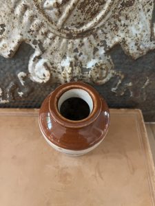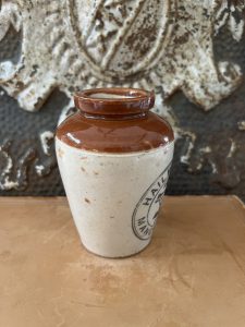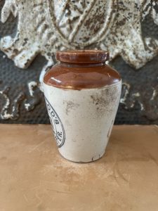 This is an authentic antique advertising pot sourced during my recent buying trip to England. I have been sourcing these wonderful antique pots for over 12 years from sources who are actually digging them up in ancient rubbish sites all over England. I purchased my first antique Advertising pot when my husband and I had the wonderful opportunity to live in England in the 1980’s. Our daughter was born there and we enjoyed living in England so much we often went back to visit after returning to the US.