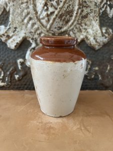 The two-tone salt-glazed (brown top, cream base) was a popular style for cream and preserve jars. The cow motif and wording “Rich Cream” served both as branding and a guarantee of quality. This pot is in very good condition with no chips or cracks.