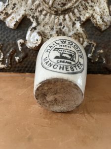 Hailwood’s was a well-known Manchester-based dairy company in the late 19th and early 20th centuries. They specialized in selling rich cream and other dairy products, which were distributed in distinctive stoneware jars like this one. Stoneware was commonly used because it was durable and helped preserve dairy products before the widespread use of glass bottles and refrigeration.