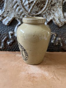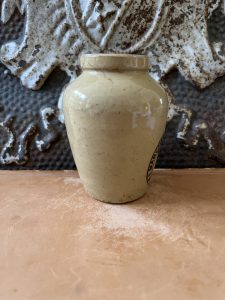 This is an authentic antique advertising pot sourced during my recent buying trip to England. I have been sourcing these wonderful antique pots for over 12 years from sources who are actually digging them up in ancient rubbish sites all over England. I purchased my first antique Advertising pot when my husband and I had the wonderful opportunity to live in England in the 1980’s. Our daughter was born there and we enjoyed living in England so much we often went back to visit after returning to the US.