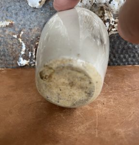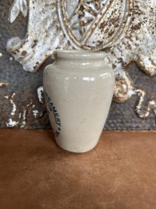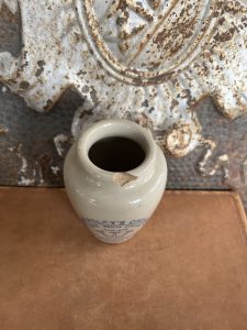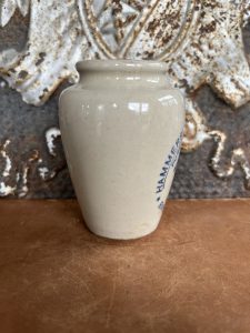 This is an authentic antique advertising pot sourced during my recent buying trip to England. I have been sourcing these wonderful antique pots for over 12 years from friends who are actually digging them up in ancient rubbish sites all over England. I purchased my first antique Advertising pot when my husband and I had the wonderful opportunity to live in England in the 1980’s. Our daughter was born there and we enjoyed living in England so much we often went back to visit after returning to the US.