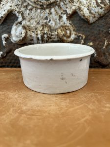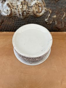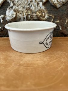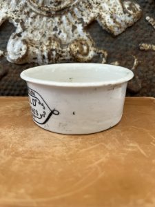 This is an authentic antique advertising pot sourced during my recent buying trip to England. I have been sourcing these wonderful antique pots for over 12 years from sources who are actually digging them up in ancient rubbish sites all over England. I purchased my first antique Advertising pot when my husband and I had the wonderful opportunity to live in England in the 1980’s. Our daughter was born there and we enjoyed living in England so much we often went back to visit after returning to the US.