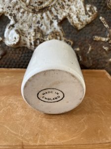 This is an authentic antique advertising pot sourced during my recent buying trip to England. I have been sourcing these wonderful antique pots for over 12 years from sources who are actually digging them up in ancient rubbish sites all over England. I purchased my first antique Advertising pot when my husband and I had the wonderful opportunity to live in England in the 1980’s. Our daughter was born there and we enjoyed living in England so much we often went back to visit after returning to the US.