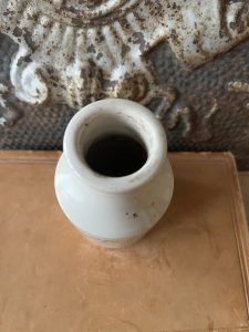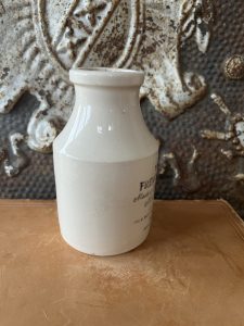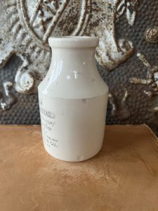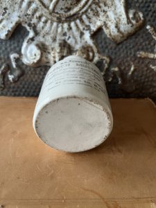 This is an authentic antique advertising pot sourced during my recent buying trip to England. I have been sourcing these wonderful antique pots for over 12 years from sources who are actually digging them up in ancient rubbish sites all over England. I purchased my first antique Advertising pot when my husband and I had the wonderful opportunity to live in England in the 1980’s. Our daughter was born there and we enjoyed living in England so much we often went back to visit after returning to the US.