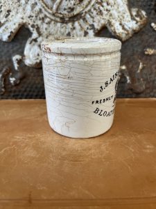 Antique J. Sainsbury BLOATER PASTE Pot in the rarer larger size. Bloater paste” is fish paste made from bloaters—a kind of smoked herring that was popular in England, especially in the late 19th and early 20th centuries. It was a staple of British working-class diets, often spread on bread or toast. It measures approximately 3″ tall x 2 1/4” diameter