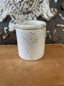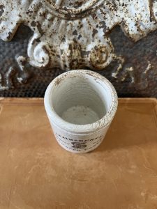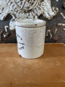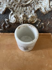 This is an authentic antique advertising pot sourced during my recent buying trip to England. I have been sourcing these wonderful antique pots for over 12 years from sources who are actually digging them up in ancient rubbish sites all over England. I purchased my first antique Advertising pot when my husband and I had the wonderful opportunity to live in England in the 1980’s. Our daughter was born there and we enjoyed living in England so much we often went back to visit after returning to the US.