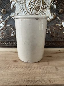 Offered is this great Kilverts Salt crock with Lid. The company was based in Trafford Park, Manchester and exhibited their products at the 1887 Royal Jubilee Exhibition in Manchester. This crock was used for salt and is a large 6”tall x 4 ¼” diameter base with the makers name incised into the pot . Made of heavy Stoneware in a lovely putty/stone coloring with lid. It is in good condition with one flat chip on the lid and two small ones on the top rim of the base and one on the inside base. A great piece, large sized and character filled perfect for your kitchen as decor.