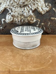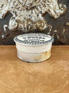 Offering this Large Antique English Woods Areca Nut with a RARE 1s (1 Schilling) size, Tooth Paste, lidded pot. It reads: “For removing Tartar and whitening the Teeth without injury to the Enamel. Proprietor W. Woods, Chemist, Plymouth.” As time went on, some concerns over the health impact of Areca Nut resulted in makers of toothpaste eliminating it in favor of safer additives like fluoride. It makes it a great collector item.