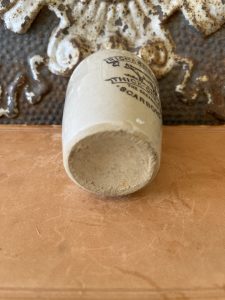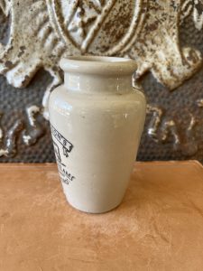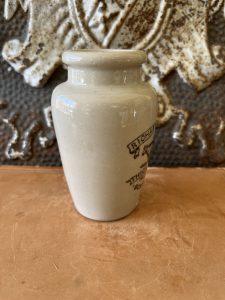 These are all authentic antique advertising pots sourced during my recent buying trip to England. I have been sourcing these wonderful antique pots for over 12 years from friends who are actually digging them up in ancient rubbish sites all over England. I purchased my first antique Advertising pot when my husband and I had the wonderful opportunity to live in England in the 1980’s. Our daughter was born there and we enjoyed living in England so much we often went back to visit after returning to the US.