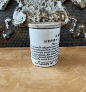 Offered is this rare Nature’s Herbal Ointment miniature apothecary pot w/ great fitting lid. This charming pot has printing covering most of its surface. The identity is Fred W. Hale, 61 Chandos St., Covent Garden, London.