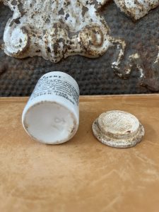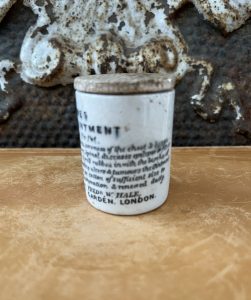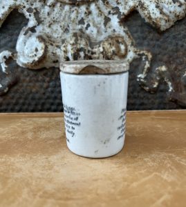 This is an authentic antique advertising pot sourced during my recent buying trip to England. I have been sourcing these wonderful antique pots for over 12 years from sources who are actually digging them up in ancient rubbish sites all over England. I purchased my first antique Advertising pot when my husband and I had the wonderful opportunity to live in England in the 1980’s. Our daughter was born there and we enjoyed living in England so much we often went back to visit after returning to the US.