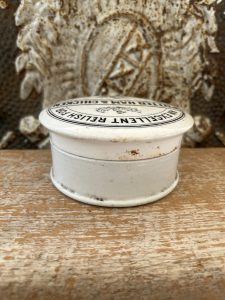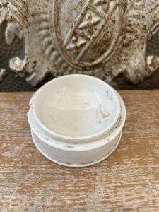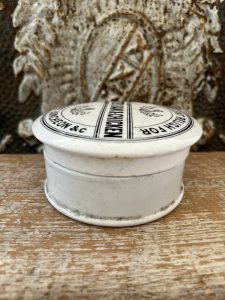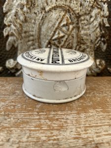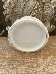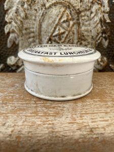 This is an authentic antique advertising pots sourced during my recent buying trip to England. I have been sourcing these wonderful antique pots for over 12 years from friends who are actually digging them up in ancient rubbish sites all over England. I purchased my first antique Advertising pot when my husband and I had the wonderful opportunity to live in England in the 1980’s. Our daughter was born there and we enjoyed living in England so much we often went back to visit after returning to the US.