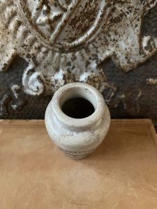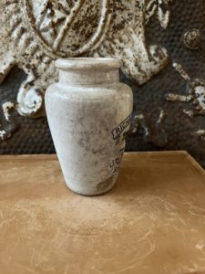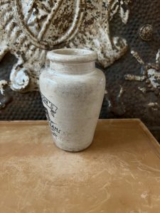 This is an authentic antique advertising pot sourced during my recent buying trip to England. I have been sourcing these wonderful antique pots for over 12 years from friends who are actually digging them up in ancient rubbish sites all over England. I purchased my first antique Advertising pot when my husband and I had the wonderful opportunity to live in England in the 1980’s. Our daughter was born there and we enjoyed living in England so much we often went back to visit after returning to the US.