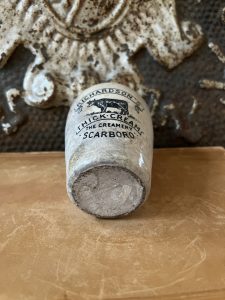Offering this charming RICHARDSON’S THICK CREAM – The Creamery, Scarboro. Very sweet and old appearance antique English advertising piece with a Cow trademark, medium size. Stoneware pots like these were used because it kept dairy products cool and fresh longer before refrigeration was common. Companies like Richardson’s would have delivered or sold these jars locally, and sometimes tourists would take them home as souvenirs.