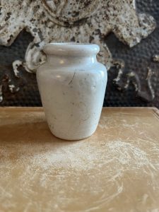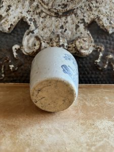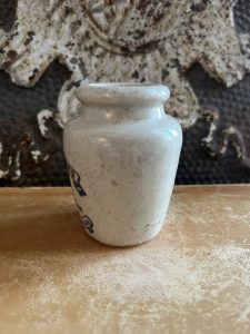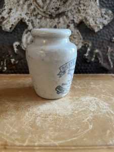 These are all authentic antique advertising pots sourced during my recent buying trip to England. I have been sourcing these wonderful antique pots for over 12 years from friends who are actually digging them up in ancient rubbish sites all over England. I purchased my first antique Advertising pot when my husband and I had the wonderful opportunity to live in England in the 1980’s. Our daughter was born there and we enjoyed living in England so much we often went back to visit after returning to the US.