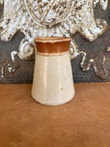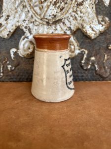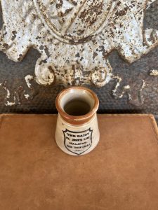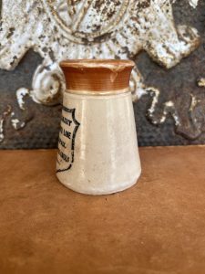 This is an authentic antique advertising pot sourced during my recent buying trip to England. I have been sourcing these wonderful antique pots for over 12 years from friends who are actually digging them up in ancient rubbish sites all over England. I purchased my first antique Advertising pot when my husband and I had the wonderful opportunity to live in England in the 1980’s. Our daughter was born there and we enjoyed living in England so much we often went back to visit after returning to the US.