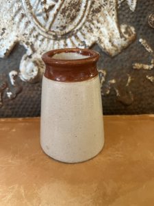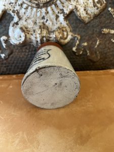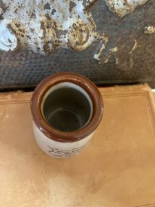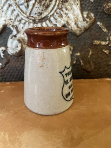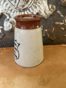 This is an authentic antique advertising pot sourced during my recent buying trip to England. I have been sourcing these wonderful antique pots for over 12 years from friends who are actually digging them up in ancient rubbish sites all over England. I purchased my first antique Advertising pot when my husband and I had the wonderful opportunity to live in England in the 1980’s. Our daughter was born there and we enjoyed living in England so much we often went back to visit after returning to the US.