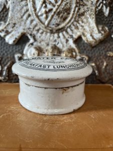 This listing is for this antique ironstone pot for Bloater Paste — a once-popular fish relish enjoyed at breakfast, luncheon, and beyond. Produced in the late 1800s, this pot lid features bold black transfer lettering and a circular design, with decorative thistle motifs, making it a standout piece for any collector of antique advertising pots or kitchenalia.