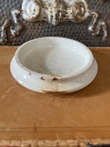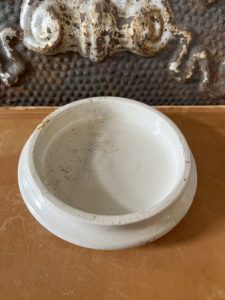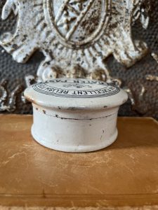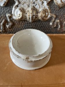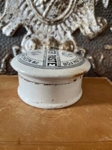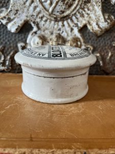 This is an authentic antique advertising pot sourced during my recent buying trip to England. I have been sourcing these wonderful antique pots for over 12 years from friends who are actually digging them up in ancient rubbish sites all over England. I purchased my first antique Advertising pot when my husband and I had the wonderful opportunity to live in England in the 1980’s. Our daughter was born there and we enjoyed living in England so much we often went back to visit after returning to the US.