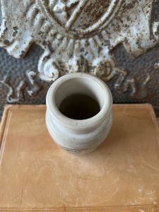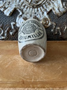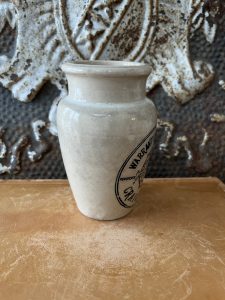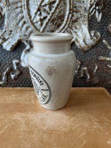 This is an authentic antique advertising pot sourced during my recent buying trip to England. I have been sourcing these wonderful antique pots for over 12 years from friends who are actually digging them up in ancient rubbish sites all over England. I purchased my first antique Advertising pot when my husband and I had the wonderful opportunity to live in England in the 1980’s. Our daughter was born there and we enjoyed living in England so much we often went back to visit after returning to the US.