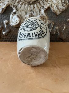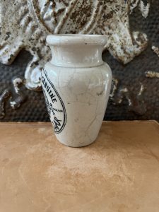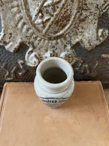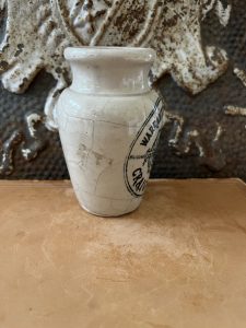 This is an authentic antique advertising pot sourced during my recent buying trip to England. I have been sourcing these wonderful antique pots for over 12 years from friends who are actually digging them up in ancient rubbish sites all over England. I purchased my first antique Advertising pot when my husband and I had the wonderful opportunity to live in England in the 1980’s. Our daughter was born there and we enjoyed living in England so much we often went back to visit after returning to the US.