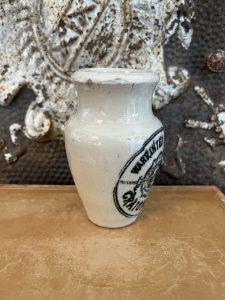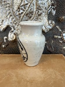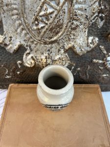 This is an authentic antique advertising pot sourced during my recent buying trip to England. I have been sourcing these wonderful antique pots for over 12 years from friends who are actually digging them up in ancient rubbish sites all over England. I purchased my first antique Advertising pot when my husband and I had the wonderful opportunity to live in England in the 1980’s. Our daughter was born there and we enjoyed living in England so much we often went back to visit after returning to the US.