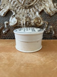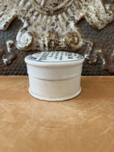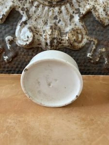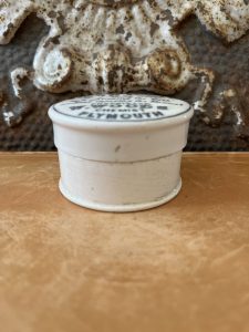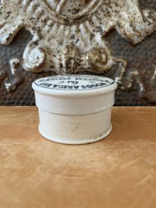 This authentic English antique advertising pot was sourced during my recent buying trip to England. I have been sourcing these wonderful antique pots for over 12 years from sources who are actually digging them up in ancient rubbish sites all over England. I purchased my first antique Advertising pot when my husband and I had the wonderful opportunity to live in England in the 1980’s. Our daughter was born there and we enjoyed living in England so much we often went back to visit after returning to the US.