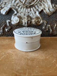 Offering this Antique English Woods Areca Nut Tooth Paste lidded pot. It reads: “For removing Tartar and Whitening the Teeth without injuring the Enamel. Proprietor W. Woods Chemist, Plymouth.”