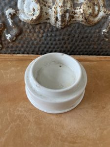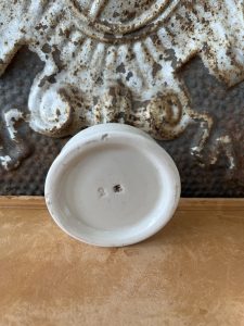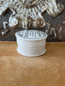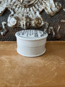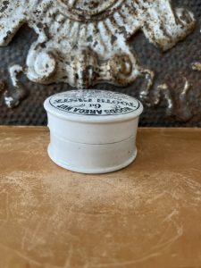 This authentic English antique advertising pot was sourced during my recent buying trip to England. I have been sourcing these wonderful antique pots for over 12 years from sources who are actually digging them up in ancient rubbish sites all over England. I purchased my first antique Advertising pot when my husband and I had the wonderful opportunity to live in England in the 1980’s. Our daughter was born there and we enjoyed living in England so much we often went back to visit after returning to the US.