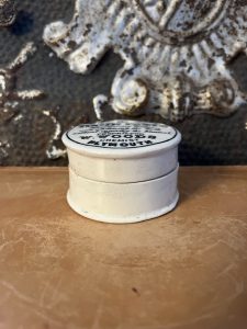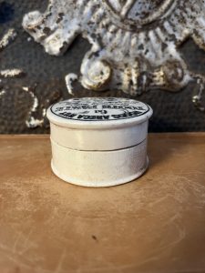 This authentic English antique advertising pot was sourced during my recent buying trip to England. I have been sourcing these wonderful antique pots for over 12 years from sources who are actually digging them up in ancient rubbish sites all over England. I purchased my first antique Advertising pot when my husband and I had the wonderful opportunity to live in England in the 1980’s. Our daughter was born there and we enjoyed living in England so much we often went back to visit after returning to the US.
