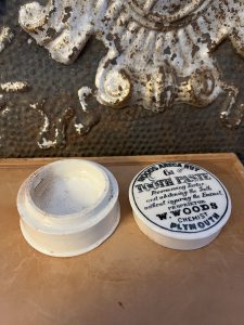Offering this Antique English Woods Areca Nut Tooth Paste lidded pot. It reads: “For removing Tartar and Whitening the Teeth without injuring the Enamel. Proprietor W. Woods Chemist, Plymouth.”
