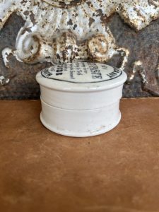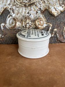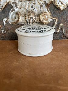 This authentic English antique advertising pot was sourced during my recent buying trip to England. I have been sourcing these wonderful antique pots for over 12 years from sources who are actually digging them up in ancient rubbish sites all over England. I purchased my first antique Advertising pot when my husband and I had the wonderful opportunity to live in England in the 1980’s. Our daughter was born there and we enjoyed living in England so much we often went back to visit after returning to the US.