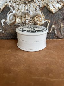 Offering this Antique English Woods Areca Nut Tooth Paste lidded pot. It reads: “For removing Tartar and Whitening the Teeth without injuring the Enamel. Proprietor W. Woods Chemist, Plymouth.”