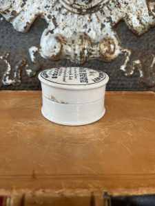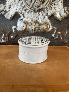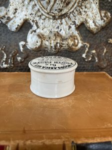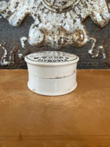 This authentic English antique advertising pot was sourced during my recent buying trip to England. I have been sourcing these wonderful antique pots for over 12 years from sources who are actually digging them up in ancient rubbish sites all over England. I purchased my first antique Advertising pot when my husband and I had the wonderful opportunity to live in England in the 1980’s. Our daughter was born there and we enjoyed living in England so much we often went back to visit after returning to the US.