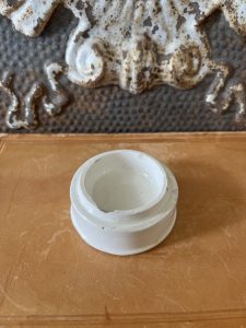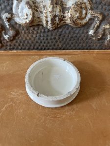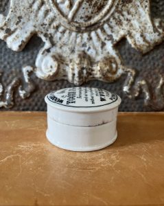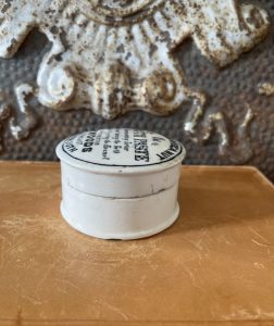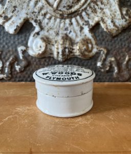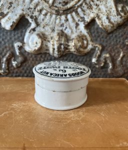 This authentic English antique advertising pot was sourced during my recent buying trip to England. I have been sourcing these wonderful antique pots for over 12 years from sources who are actually digging them up in ancient rubbish sites all over England. I purchased my first antique Advertising pot when my husband and I had the wonderful opportunity to live in England in the 1980’s. Our daughter was born there and we enjoyed living in England so much we often went back to visit after returning to the US.
