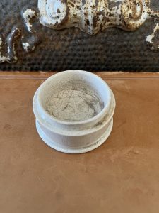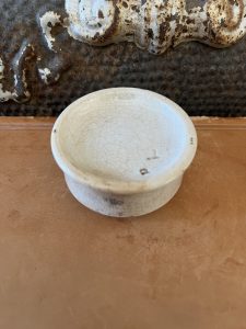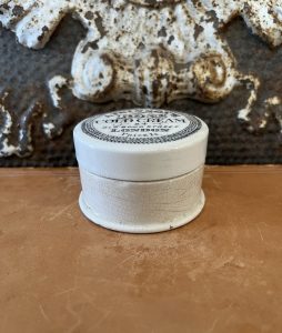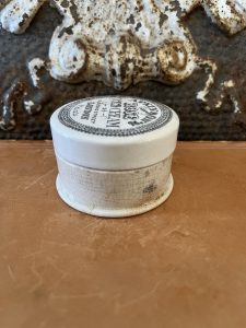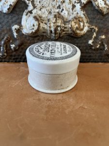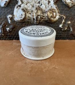 This is an authentic antique advertising pot sourced during my recent buying trip to England. I have been sourcing these wonderful antique pots for over 12 years from sources who are actually digging them up in ancient rubbish sites all over England. I purchased my first antique Advertising pot when my husband and I had the wonderful opportunity to live in England in the 1980’s. Our daughter was born there and we enjoyed living in England so much we often went back to visit after returning to the US.