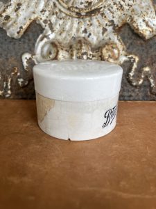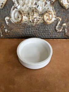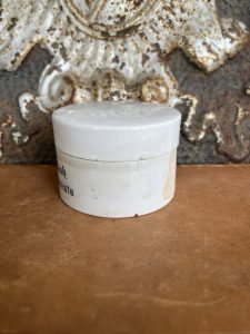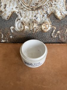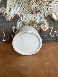 This is an authentic antique English advertising pot sourced during my recent buying trip to England. I have been sourcing these wonderful pots for over 12 years from friends who are actually digging them up in ancient rubbish sites all over England. I purchased my first antique Advertising pot when my husband and I had the wonderful opportunity to live in England in the 1980’s. Our daughter was born there and we enjoyed living in England so much we often went back to visit after returning to the US.