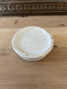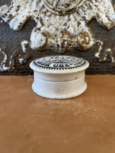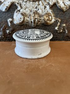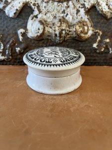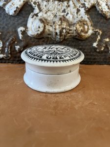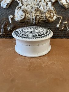 This is an authentic antique advertising pots sourced during my recent buying trip to England. I have been sourcing these wonderful antique pots for over 12 years from friends who are actually digging them up in ancient rubbish sites all over England. I purchased my first antique Advertising pot when my husband and I had the wonderful opportunity to live in England in the 1980’s. Our daughter was born there and we enjoyed living in England so much we often went back to visit after returning to the US.