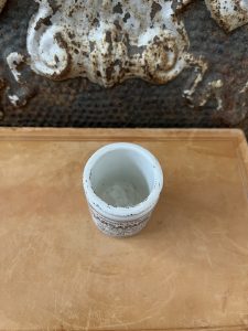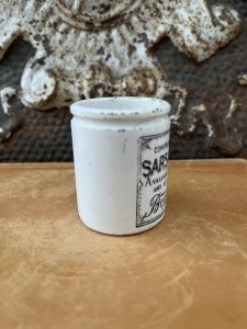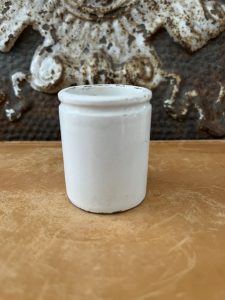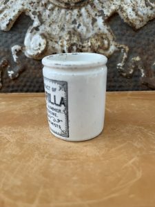 This is an authentic antique advertising pot sourced during my recent buying trip to England. I have been sourcing these wonderful antique pots for over 10 years from sources who are actually digging them up in ancient rubbish sites all over England. I purchased my first antique Advertising pot when my husband and I had the wonderful opportunity to live in England in the 1980’s. Our daughter was born there and we enjoyed living in England so much we often went back to visit after returning to the US.