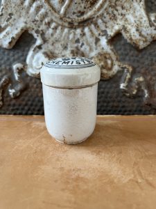 This offering is for this sweet miniature Ironstone Boot’s Cash Chemists Printed Button Top Lid with plain Ironstone base. The printed lid is in good condition with light crazing and no chips or cracks. The ironstone base is also in good condition with age coloring and one chip on the top rim not visible with the lid in place.
