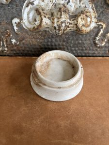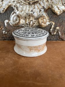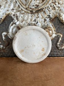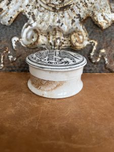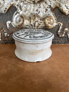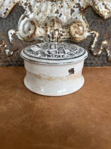 This is an authentic antique advertising pot sourced during my recent buying trip to England. I have been sourcing these wonderful antique pots for over 12 years from friends who are actually digging them up in ancient rubbish sites all over England. I purchased my first antique Advertising pot when my husband and I had the wonderful opportunity to live in England in the 1980’s. Our daughter was born there and we enjoyed living in England so much we often went back to visit after returning to the US.