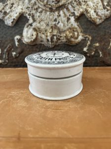 Offering this wonderful lidded CALVERT’S CARBOLIC Tooth Paste with base. It has a compass trade mark and reads “ONE SHILLING.” Carbolic toothpaste was an early type of toothpaste that became popular in the late 19th and early 20th centuries. It contained carbolic acid, which was valued for its antiseptic and disinfectant properties. In the late 1800s, toothpaste formulations were evolving from powders to pastes. Carbolic acid was introduced into some formulations to help kill bacteria and freshen breath. Over time, concerns about the safety of carbolic acid emerged. It could be irritating to the mouth and was toxic if ingested in large amounts.