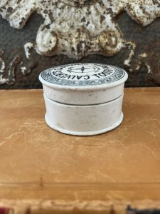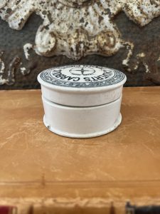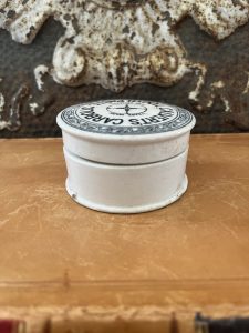 This is an authentic antique advertising pot sourced during my recent buying trip to England. I have been sourcing these wonderful antique pots for over 12 years from friends who are actually digging them up in ancient rubbish sites all over England. I purchased my first antique Advertising pot when my husband and I had the wonderful opportunity to live in England in the 1980’s. Our daughter was born there and we enjoyed living in England so much we often went back to visit after returning to the US.
