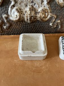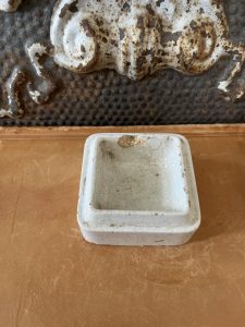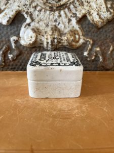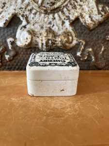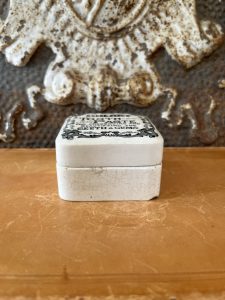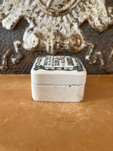 This is an authentic antique advertising pot sourced during my recent buying trip to England. I have been sourcing these wonderful antique pots for over 12 years from friends who are actually digging them up in ancient rubbish sites all over England. I purchased my first antique Advertising pot when my husband and I had the wonderful opportunity to live in England in the 1980’s. Our daughter was born there and we enjoyed living in England so much we often went back to visit after returning to the US.