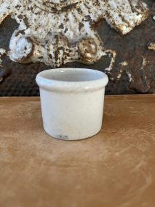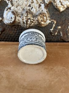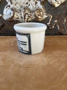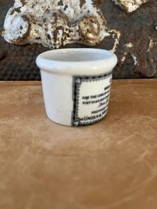 This is an authentic antique advertising pot sourced during my recent buying trip to England. I have been sourcing these wonderful antique pots for over 12 years from sources who are actually digging them up in ancient rubbish sites all over England. I purchased my first antique Advertising pot when my husband and I had the wonderful opportunity to live in England in the 1980’s. Our daughter was born there and we enjoyed living in England so much we often went back to visit after returning to the US.