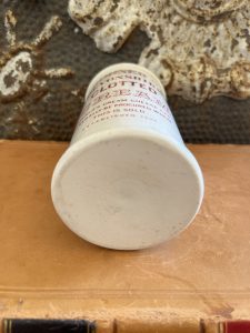 This authentic antique advertising pot was sourced during my recent buying trip to England. I have been sourcing these wonderful antique pots for over 12 years from friends who are actually digging them up in ancient rubbish sites all over England. I purchased my first antique Advertising pot when my husband and I had the wonderful opportunity to live in England in the 1980’s. Our daughter was born there and we enjoyed living in England so much we often went back to visit after returning to the US.