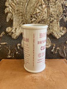 EXCELLENT CONDITION – Offering this printed Horner’s Devonshire Clotted Cream Cylinder Pot in a pink-rose colored print. Horner’s Dairy was a well-known producer of clotted cream in Devon, England. The business was established in 1846, as noted on the pot. These jars were used to package and market clotted cream, a rich, thick cream made by slowly heating full-cream cow’s milk and allowing it to cool so that the cream rises to the surface. The back side of the pot promotes its uses — for tarts, stewed fruits, coffee, chocolate, and as a nutritious food. It even notes that it was “recommended and prescribed by the Medical Profession”, reflecting marketing approaches used during the Victorian era.