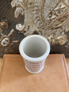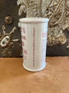 This authentic antique advertising pot was sourced during my recent buying trip to England. I have been sourcing these wonderful antique pots for over 12 years from friends who are actually digging them up in ancient rubbish sites all over England. I purchased my first antique Advertising pot when my husband and I had the wonderful opportunity to live in England in the 1980’s. Our daughter was born there and we enjoyed living in England so much we often went back to visit after returning to the US.