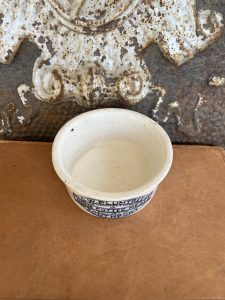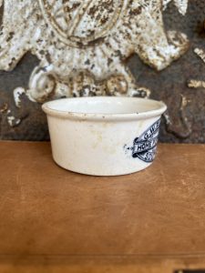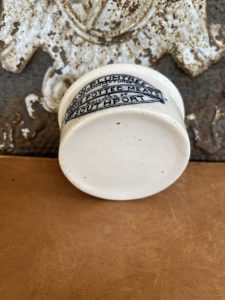 This is an authentic antique advertising pot. I have been sourcing these wonderful antique pots for over 12 years from sources who are actually digging them up in ancient rubbish sites all over England. I purchased my first antique Advertising pot when my husband and I had the wonderful opportunity to live in England in the 1980’s. Our daughter was born there and we enjoyed living in England so much we often went back to visit after returning to the US.
