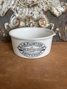 This is a listing for one (1) G. W. PLUMTREE POTTED MEAT POT Crock 164 Portland Street, Southport, dated between 1880 and 1920’s. Pots like this were typically filled with potted beef, ham, or tongue, cooked and sealed under fat, sealed with a waxed paper or ceramic lid and sold in local shops.